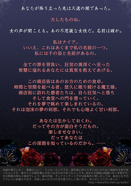 このような舞台を作った存在こそが、ナイアと呼ばれる不思議な女性です。彼女は歪んだ空間に商店街と言うステージを作り、そこで蠢く狂気的なキャストを呼び出し、そして外の世界から人々を呼び寄せていたのです。そう、あなたたちは邪神のための贄、食事だったのです。